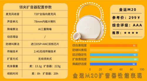2、金运M20无线领夹扩音器金运M20主打简约轻量化设计,夹持稳固不松动,挂戴或夹在衣物上都贴合便捷,久用也无累赘感。它输出音量充足且音质通透,人声还原度高、层次分明,课堂授课、商务会议、户外活动等场景都能轻松hold住。搭载专属降噪处理技术,能精准过滤外界环境杂音,进一步提升语音清晰度,让信息传达更顺畅高效。设备搭载2.4G无线传输方案,连接稳定且覆盖范围广,大幅降低信号断连或延迟的情况。同时支持无线与有线模式自由切换,搭配 Type-C快充接口,麦克风续航约8小时、扩音器续航长达20小时,还兼容3.5mm接口、TF卡/U盘读取及AUX播放功能,实用性拉满。不过在极端嘈杂环境下,音频可能出现轻微干扰;其重量适中,长时间使用时可调整佩戴方式,保障舒适体验。