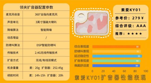 10、索爱KY01无线领夹扩音器索爱KY01在佩戴设计上非常贴心,麦克风20g、扩音器252.45g,领夹式设计轻巧稳固,即使长时间授课或户外使用,也不会产生压迫感或肩颈疲劳。配备全指向麦克风和3英寸强磁大喇叭,结合智能降噪与DSP防啸叫技术,即便在嘈杂环境中,也能保证声音清晰、通透。支持2.4G无线传输,覆盖距离可达30米,同时兼容有线模式,提供Type-C与3.5mm接口连接,支持录音、蓝牙播放及TF卡扩展功能,使用更灵活多样。麦克风续航约14-15小时,扩音器续航约20小时,能够轻松应对全天课程或外出活动。整体来看,KY01在声音清晰、续航持久、操作便捷方面表现均衡,非常适合教师、讲师及小型活动场景。不过,扩音器音量虽充足,但在大面积户外或高噪声环境下的低频表现略有限,对极端音效需求的用户略显不足,但性价比依然很高。四、无线领夹扩音器小科普1、无线领夹扩音器和普通扩音器差别在哪?