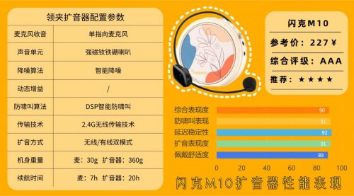 9、闪克M10无线领夹扩音器闪克M10在佩戴设计上延续了舒适与轻便理念,麦克风30g、扩音器360g,头戴式设计贴合肩颈曲线,长时间使用也不易疲劳。配备单指向麦克风和强磁钕铁硼喇叭,结合智能降噪与防啸叫功能,即便在嘈杂环境中,讲解或授课的声音依然清晰自然。支持2.4G无线传输,覆盖距离10米,同时保留有线模式,兼容Type-C和3.5mm接口,拓展U盘/MP3播放功能,一键录音和回放操作便捷,使用灵活。麦克风续航约7小时,扩音器续航约20小时,满足全天授课或户外活动需求。整体来看,M10在清晰收音、续航稳定、使用灵活方面表现均衡,非常适合教育、培训及会议场景。不过,相比顶级旗舰,扩音器低频冲击力略显一般,对追求极致声场感的用户可能略有不足,但性价比仍十分突出。