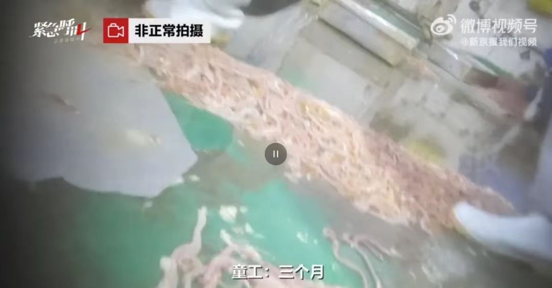 昏暗的车间里面,污水四处横流,清洗鸭肠的机器和车间的墙壁都已经被黑黑的油污包浆了,工人穿着胶靴在鸭肠堆旁边随意穿梭……