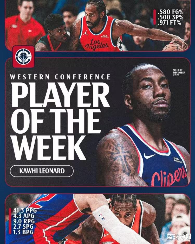 在这波5连胜的比赛里,小卡攻防一体数据出色,上周的精彩表现让他获得了周最佳球员: