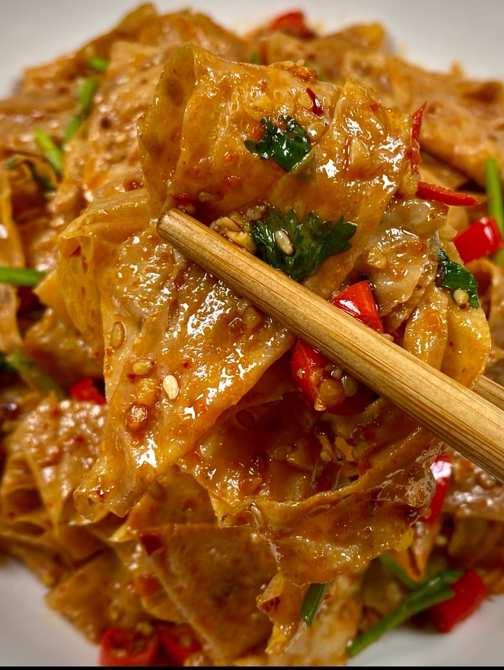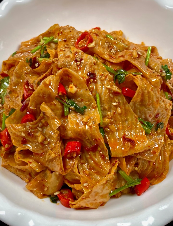 当那盘热气腾腾、香气四溢的香辣孜然豆皮端上桌时,我的目光瞬间就被它牢牢吸引住了。豆皮表面裹着一层诱人的红油,上面均匀撒着翠绿的葱花和香菜,几颗饱满的孜然粒点缀其间,散发着独特的辛香。还没等动筷,那股混合着辣椒、孜然和豆皮本身香气的味道就已经钻进了鼻孔,让人垂涎欲滴。迫不及待地夹起一块送入口中,豆皮外层微焦,内里却依然保持着嫩滑,香辣的口感瞬间在舌尖炸开,随后是孜然那独特的香气,让人欲罢不能,一上桌就炫到我了,这道香辣孜然豆皮,绝对是我心中的超级好吃!