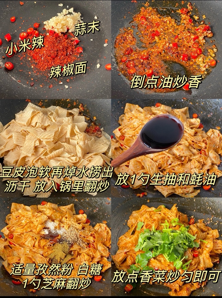 最关键的一步来了,那就是加入孜然粉和辣椒粉。这一步要格外小心,火候不能太大,以免孜然粉炒糊,影响口感。将孜然粉和辣椒粉均匀撒在豆皮上,快速翻炒,让每一根豆皮都裹上这层香辣的调料。最后,撒上葱花和香菜,翻炒几下即可出锅。