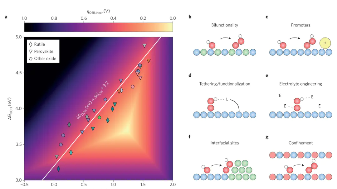电催化理论计算的典型内容通过可视化与量化分析,直观呈现催化反应的关键特征与机制,为关联理论模型与实验现象提供了重要桥梁,火山图()源于等人的研究,其横轴为H吸附能,纵轴为交换电流密度,清晰展示了不同金属催化剂的活性分布:Pt因ΔG_H0 eV正值较大位于火山左侧,强吸附金属因ΔG_H这一结果定量验证了萨巴蒂尔原理,明确了“ΔG_HDOI自由能图()在ørskov通过计算不同电极电位下的ΔG,发现当U=1.23 V(ORR平衡电位)时,*O→*OH步骤的ΔG>0,成为速率控制步骤(RDS),对应的理论过电位η=0.45 V,与实验测量值高度吻合。