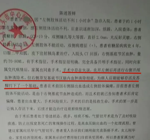 带着这个结论,潘女士找到主治医生、科室负责人以及医院相关部门,又向医调委反映情况。在多方压力下,医院最终承认手术存在失误。潘女士提供的盖有医院印章、由主治医生曾某签字的 “陈述答辩” 和 “手术过程” 记录,清晰还原了那场失误的手术:麻醉成功后,医生误将左侧当成右侧,率先对左侧额颞顶部进行开颅,清除少量硬膜下血肿后才发现错误。随后医生对左脑进行骨瓣复位、缝合,再重新对右侧实施开颅血肿清除术。