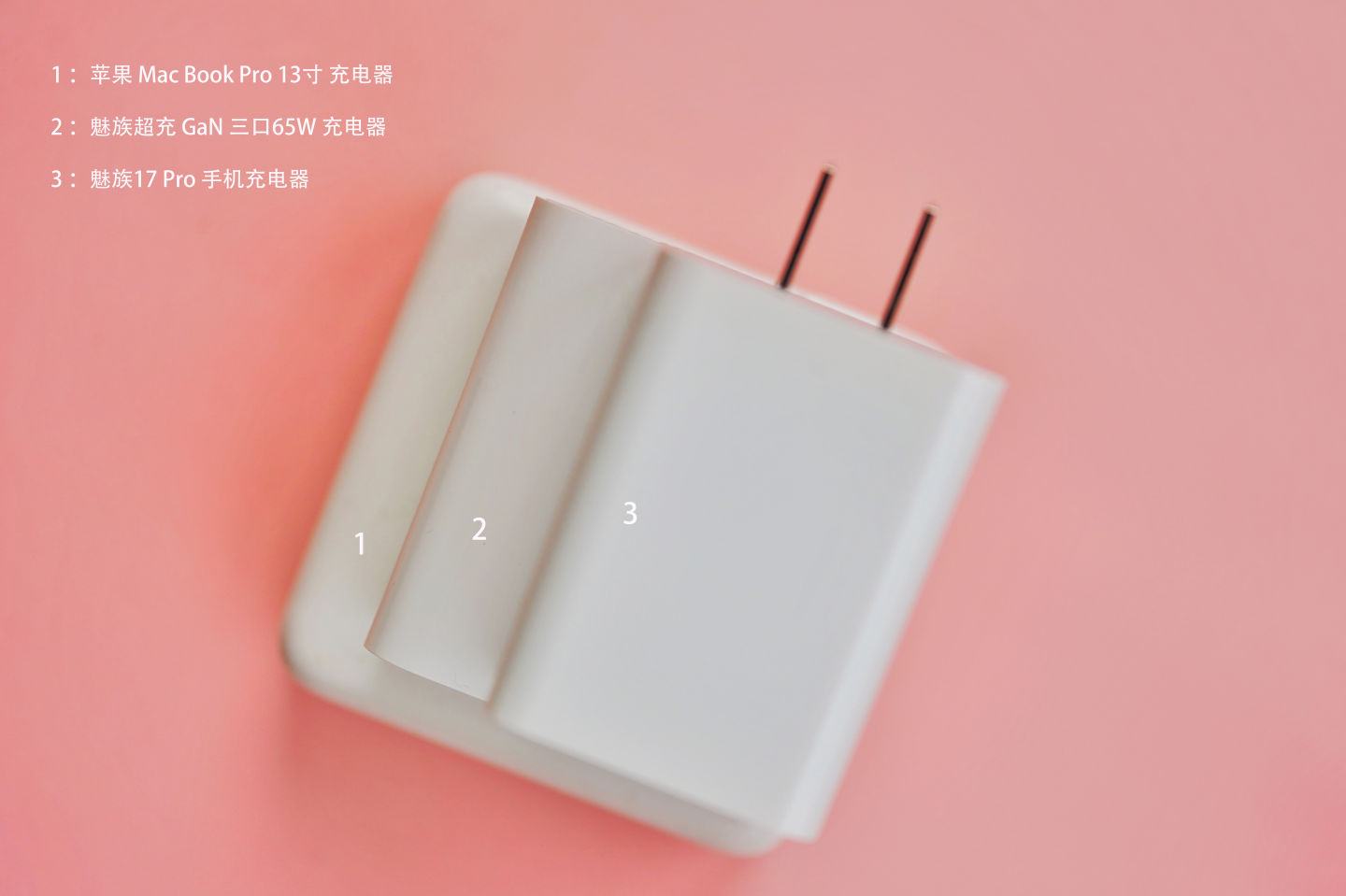 我认为一款优秀的充电头既要小巧又要轻便,同时还有兼容多种协议尽可能拥有更多接口。从体型上来看,魅族超充GaN三口充电器仅仅比魅族17Pro充电头大一点点,但是却比Mac自带的充电头小了不少,并且重量上也非常轻巧;