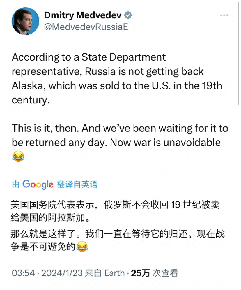 俄罗斯官员梅德韦杰夫在社交媒体上调侃地说,俄罗斯一直在等待阿拉斯加的归还,现在战争是不可避免的。他说这话时还配了个‘笑哭’的表情,显得他是在开玩笑,并不是真的要动武。阿拉斯加曾是俄罗斯帝国的领土,1867年被美国以720万美元的价格购买。阿拉斯加拥有丰富的自然资源和战略位置,对美国和俄罗斯都很重要。