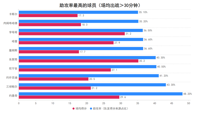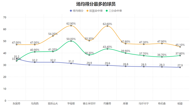 东契奇本赛季场均贡献35.2分高居联盟第一并断档式领跑联盟,两项命中率分别为47%与33.3%,同时场均还能送出9.2次助攻,单从基础数据来看他已经是攻传一体的MVP级别表现了,只是两项命中率看起来达不到联盟最佳的水准。