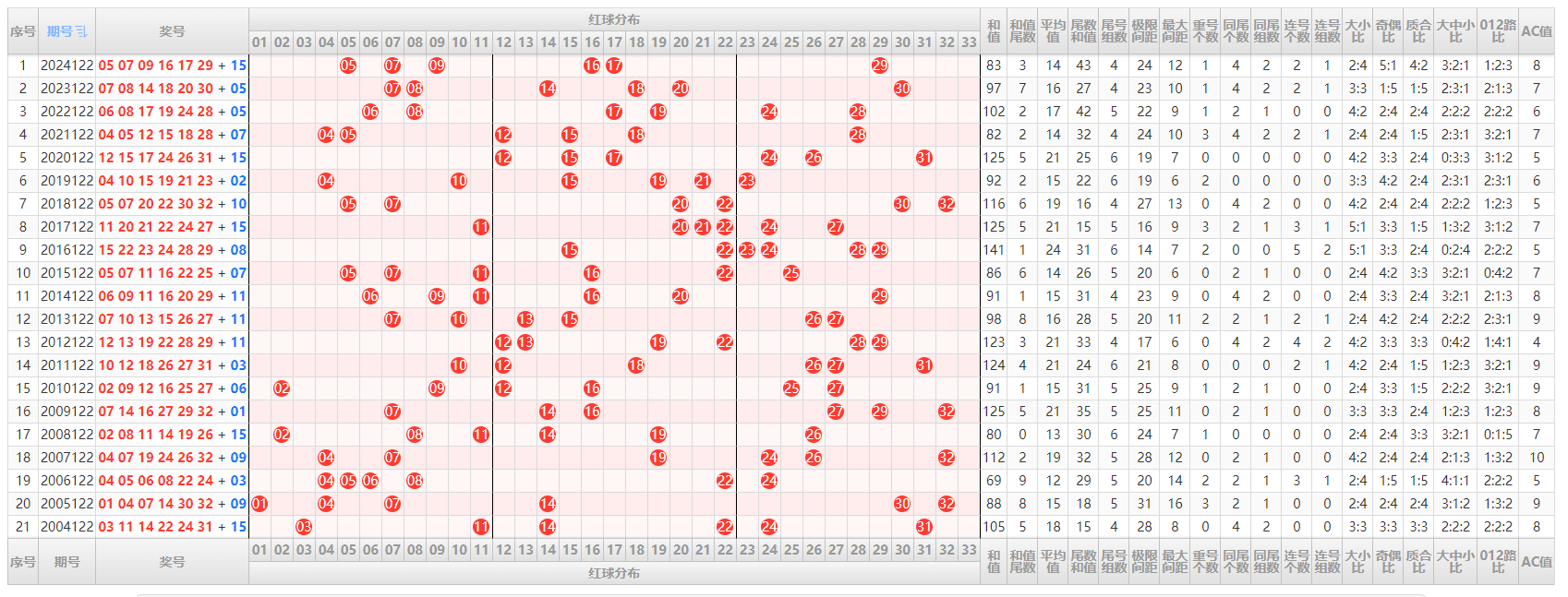 连号是常客:超过三分之一都出现了连号,而且特别喜欢在二区(12-22) 和三区(23-33) 扎堆出现,比如去年的16、17,以及2016年那串惊人的22、23、24、29。