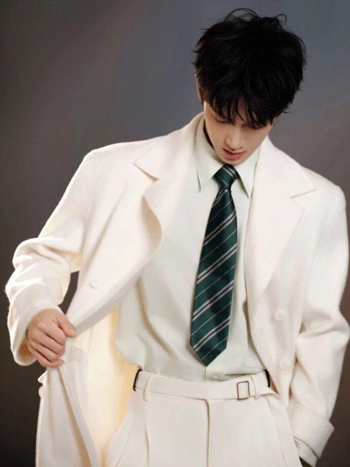 谁懂啊!男星穿纯白大衣最容易踩俩坑:要么垮成 “睡袍式慵懒” 没型,要么甜成 “奶油小生” 没锐,但李昀锐这波直接用 “香氛标签 + 版型细节” 把坑全填了 —— 一袭 SANDRO 纯白大衣配暗绿条纹领带,哪里是穿活动造型?是把 “空山栀子香代言人” 的标签,直接穿成了能看见的清隽矜贵。