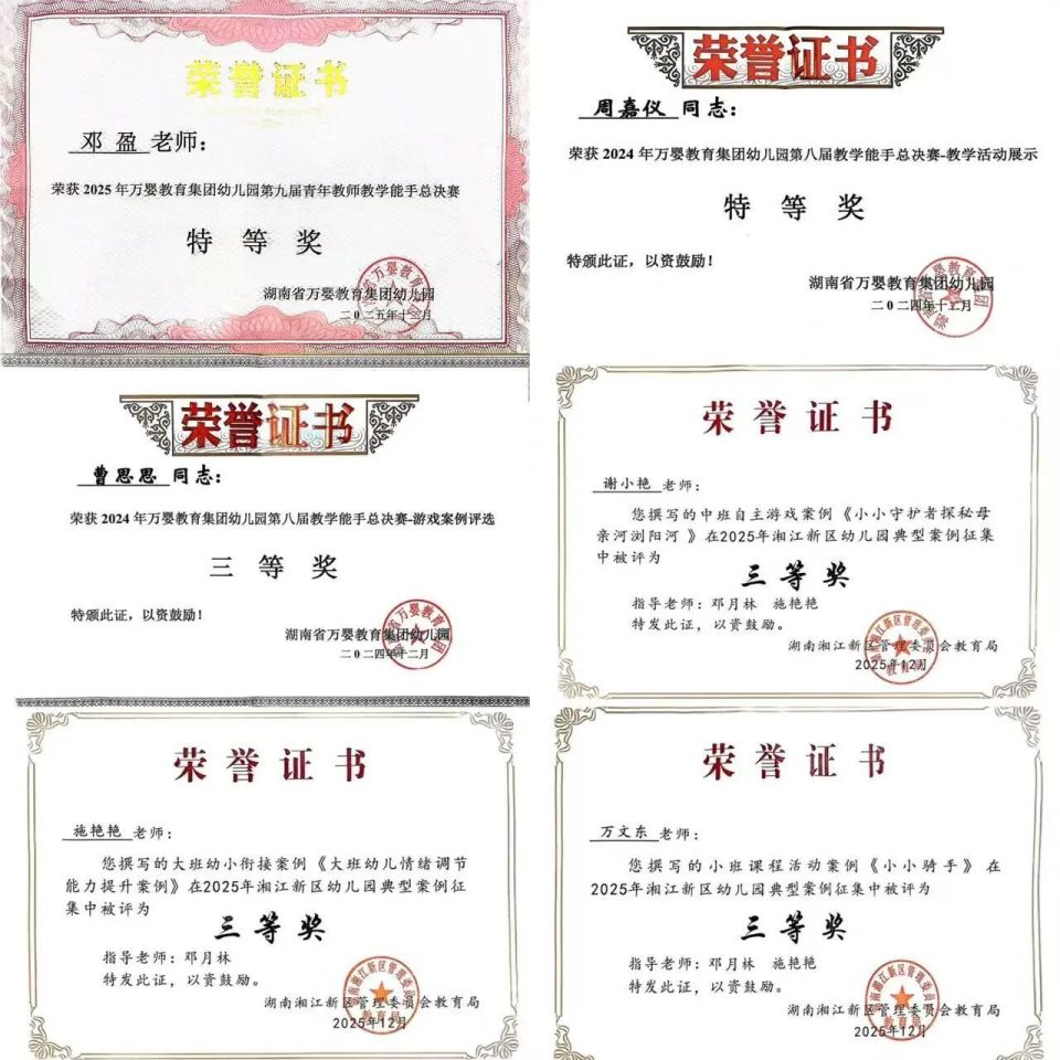 教师们在“2024年度湖南省学前教育优秀教科研案例评比”大赛中荣获三等奖;在“2024年度湖南省学前教育优秀教科研论文评比”斩获一、三等奖;在“2025年万婴教育集团幼儿园第九届青年教师教学能手总决赛”中斩获特等奖;在“2025年湘江新区幼儿园典型案例征集”中荣获三等奖...