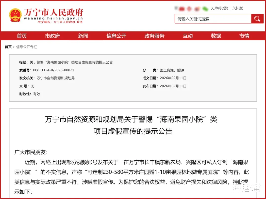 公告称,网络上出现部分视频账号发布关于“在万宁市长丰镇东新农场、兴隆区可私人订制‘海南果园小院’”的不实信息,声称“可定制230-580平方米庄园赠1-10亩果园林地做专属庭院”等内容。