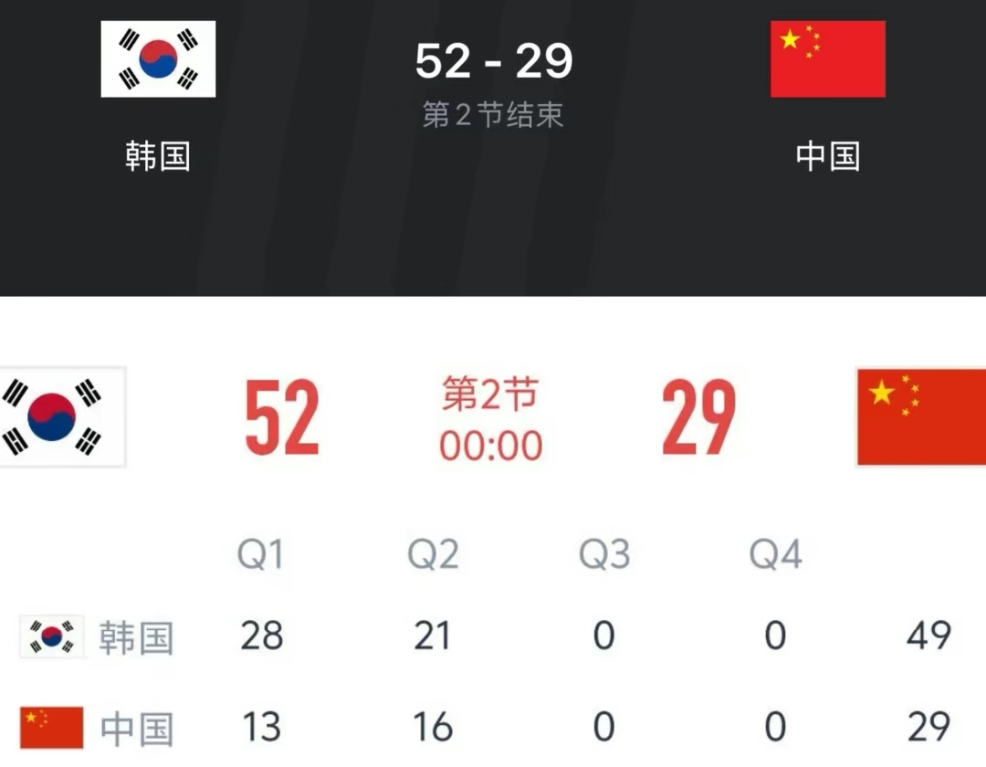 第二节,才打了3分钟,韩国已经领先17分,个个都是神枪手,投篮越投越远,越投越准!中国队则一盘散沙,开始崩盘,半场结束,中国男篮以29-52,落后韩国队23分。