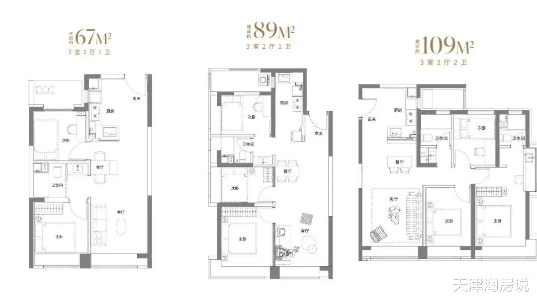 户型分别为67、89平米两室、109平米三室。