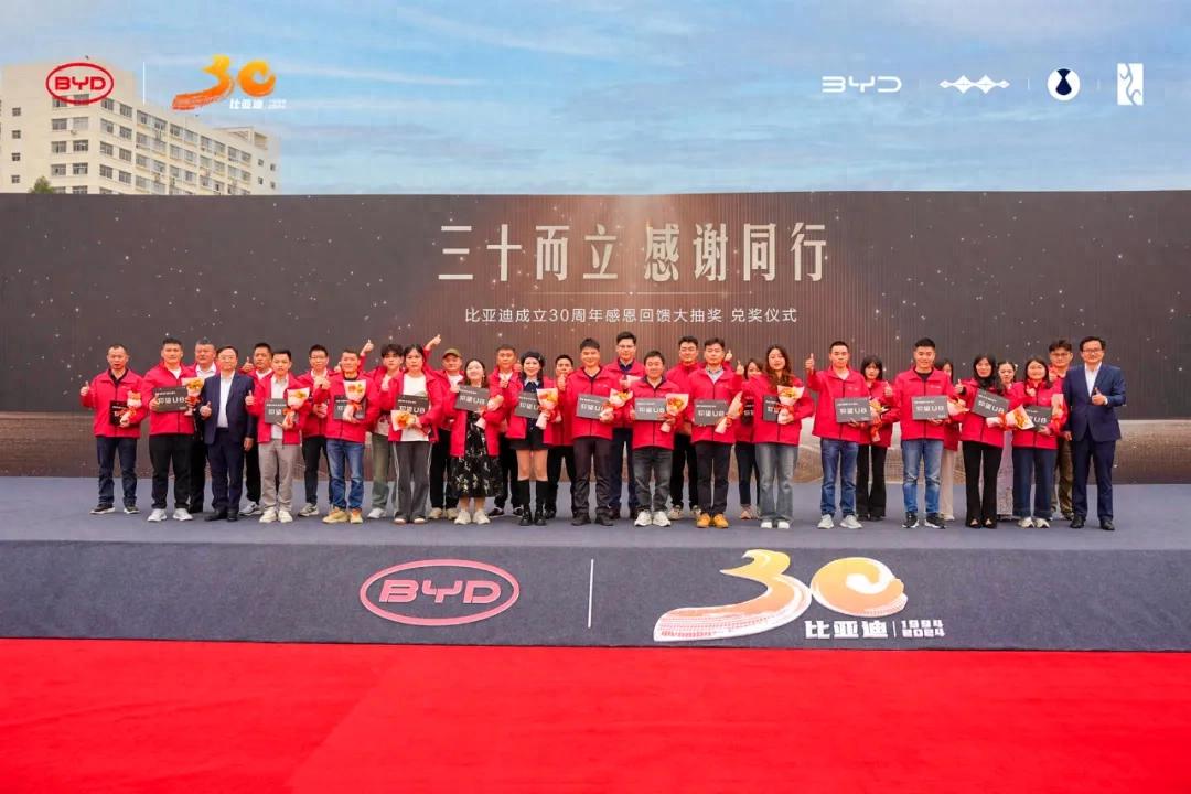 比亚迪在全球总部举行了成立30周年感恩回馈大抽奖活动,董事长王传福向60位幸运车主和30位员工分别交付了新车使用权,表达了对他们长期支持的感谢。在过去30年中,比亚迪从深圳布吉的小厂房起步,发展为近百万员工的全球新能源汽车冠军,展现了“比亚迪敢于创新、敢于挑战”的精神。
