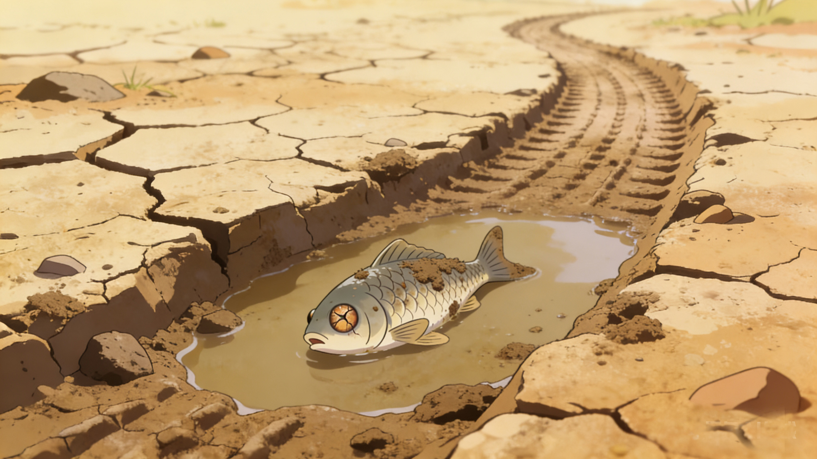 表面含义:干涸的车辙里的鲋鱼(小鱼)