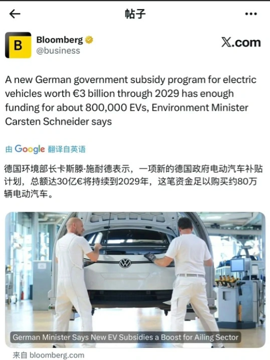 2026年1月,德国政府正式宣布重启电动汽车补贴计划,总额高达30亿欧元(约合245亿元人民币),面向所有品牌开放——包括中国车企。这意味着,购买比亚迪、小鹏、蔚来等中国电动车的德国消费者,同样能享受最高6000欧元的购车补贴。在欧洲多国对中国电动车设限的背景下,德国这一"开放绿灯"政策,为中国品牌出海欧洲打开了重要突破口。
