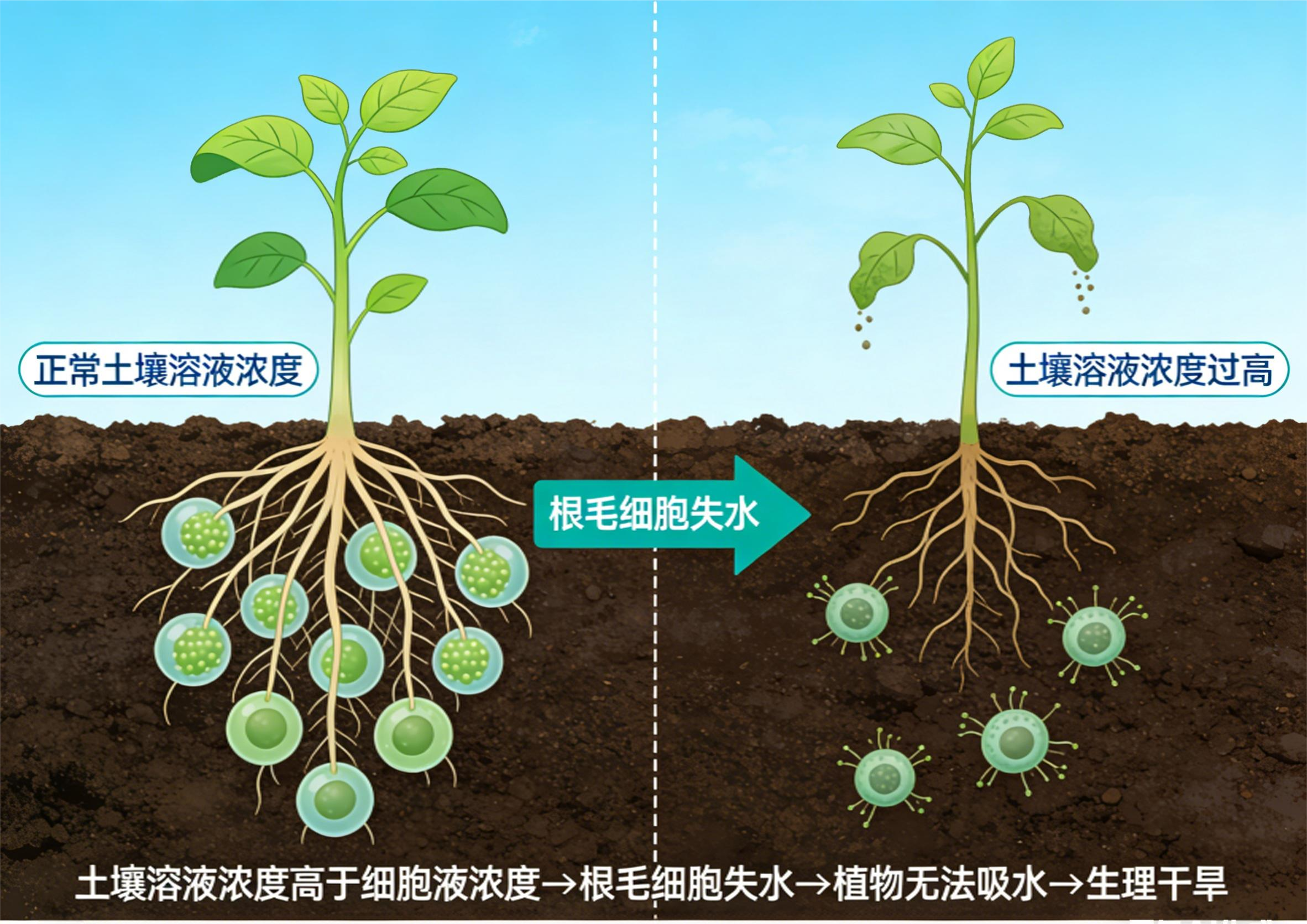 刚移栽的苗,根系有伤口,吸收功能几乎停滞。这时候如果土壤溶液浓度太高(比如施了化肥),水分不但进不去,还会从根细胞里倒吸出来——这就叫“生理干旱”。苗子本来就没缓过来,再来这么一下,轻则萎蔫几天,重则直接死苗。