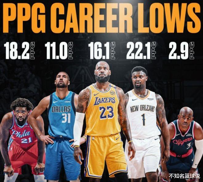 新赛季的NBA激战至今,一众老牌巨星和“玻璃人”球星齐齐创造生涯新低得分纪录。即将年满41周岁的詹姆斯本季仅有场均16.1分,恩比德场均跌至18.2分,两人均是生涯首次单赛季不足20分。保罗更是场均只剩下2.9分,且已经与快船分道扬镳,克莱场均仅11分与锡安场均22.1分均下滑。
