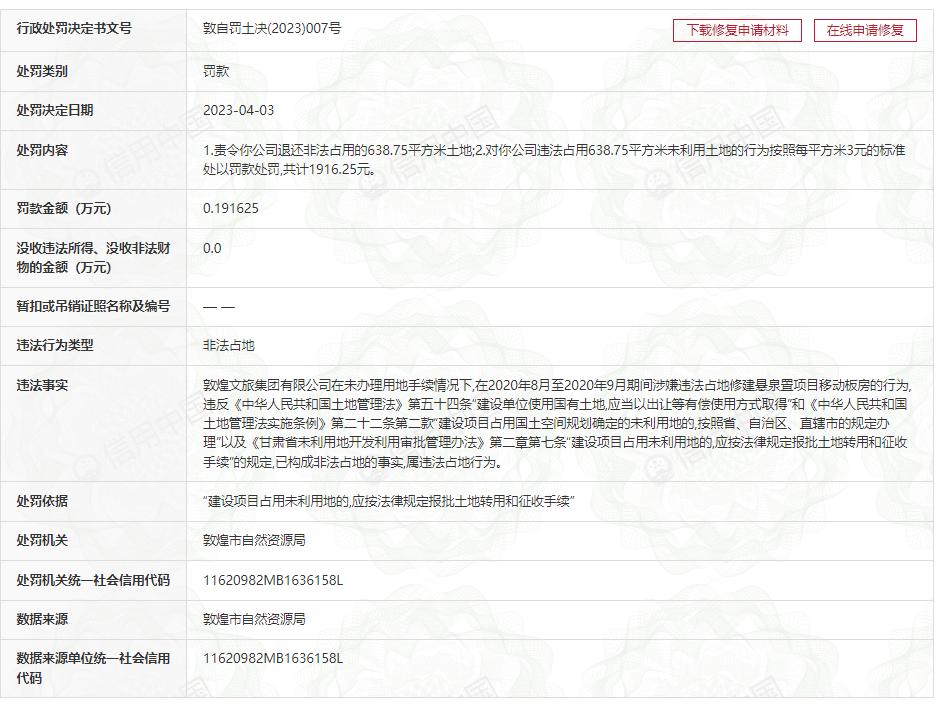 据悉,2023年4月3日,敦煌文旅集团就曾因违法占地被罚。据悉,其在未办理用地手续情况下,在2020年8月至2020年9月期间因涉嫌违法占地修建悬泉置项目移动板房,被敦煌市自然资源局责令退还非法占用的638.75平方米土地,同时,处罚机关对其违法占用638.75平方米未利用土地的行为按照每平方米3元的标准处以罚款处罚,共计1916.25元。行政处罚决定书文号:敦自罚土决(2023)007号。