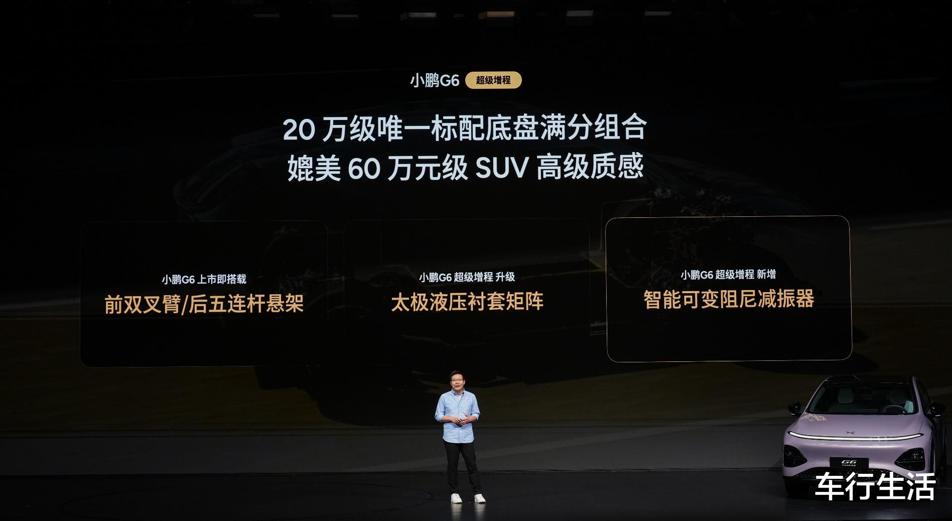 小鹏G6超级增程这次全系标配了 “太极AI底盘” 。前双叉臂/后五连杆,加上智能可变阻尼减振器,这一套组合拳下来,官方说媲美60万级SUV的高级质感。这话可能有点水分,但不可否认,这套硬件底子确实扎实。
