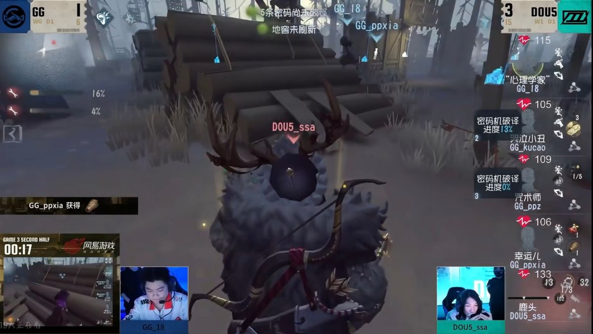 第三局比赛上半轮成都GG_xawm选出了鹿头,鹿头选择将玩具商击倒送椅,求生者两次救下玩具商后,玩具商被淘汰。随后鹿头选择控场,击伤气象学家后,求生者将密码机破译。开门战中气象学家从地窖逃脱,求生者完成三跑。下半轮DOU5_ssa选出了鹿头,鹿头选择追击“心理学家”,将其击伤后换追咒术师,并将其击倒送椅。哭泣小丑扛伤救下咒术师并帮其扛伤,下椅的咒术师在幸运儿和“心理学家”的帮扛下牵制至密码机破译完毕。开门战中鹿头淘汰咒术师和“心理学家”,完成二抓。DOU5战队取得了最终的胜利。