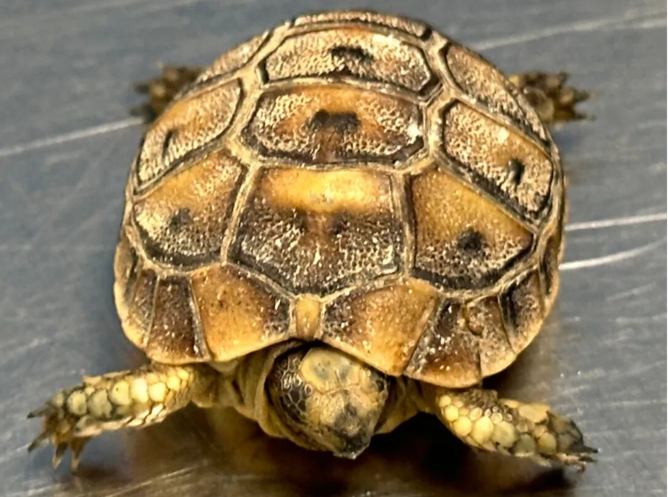 经关员开箱查验,从该旅客行李箱中的一个铁盒里查获陆龟1只,经鉴定为希腊陆龟。此外,该旅客承认还携带了象牙制品1件,干海马制品31尾。