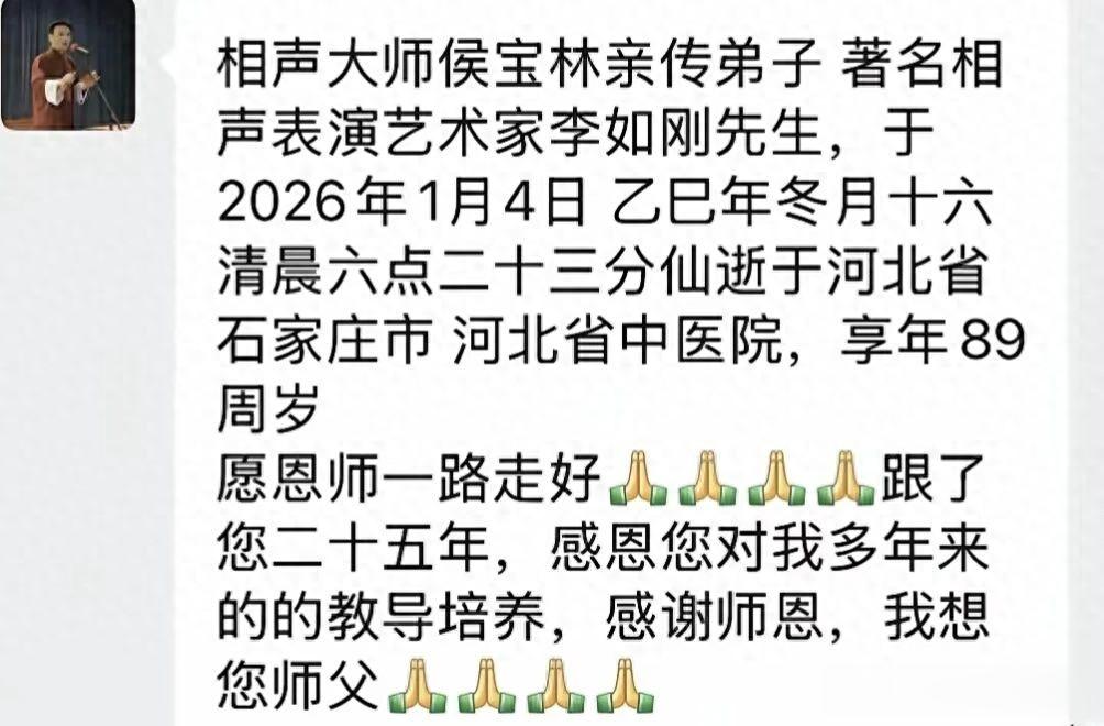 就在刚刚获悉,相声大师侯宝林的亲传弟子,著名相声表演艺术家李如刚先生于2026年1月4日,病逝于河北省石家庄市河北中医院,享年89岁。