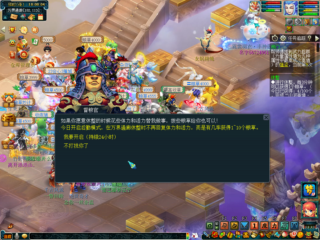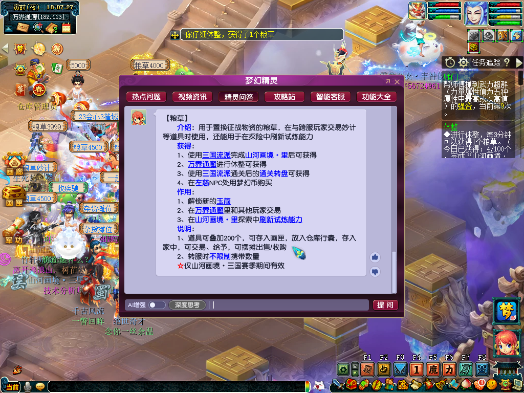 粮草获取频率:在万界通廊挂机,每 3 分钟可以获得一个粮草,一小时可以获得 20 个粮草。