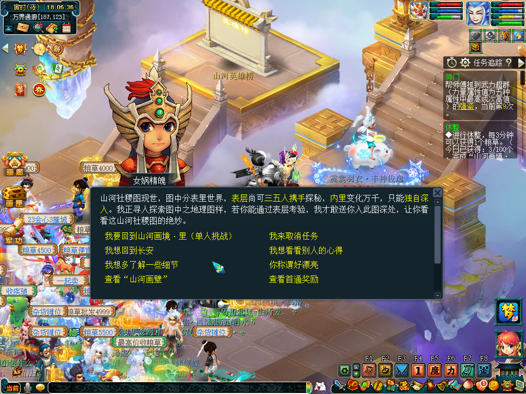 挂机地点与进入方式找到山河画境使者(或者长安城 (152,202) 的 NPC【女娲精魄】),选择前往万界通廊,即可进入挂机区域。