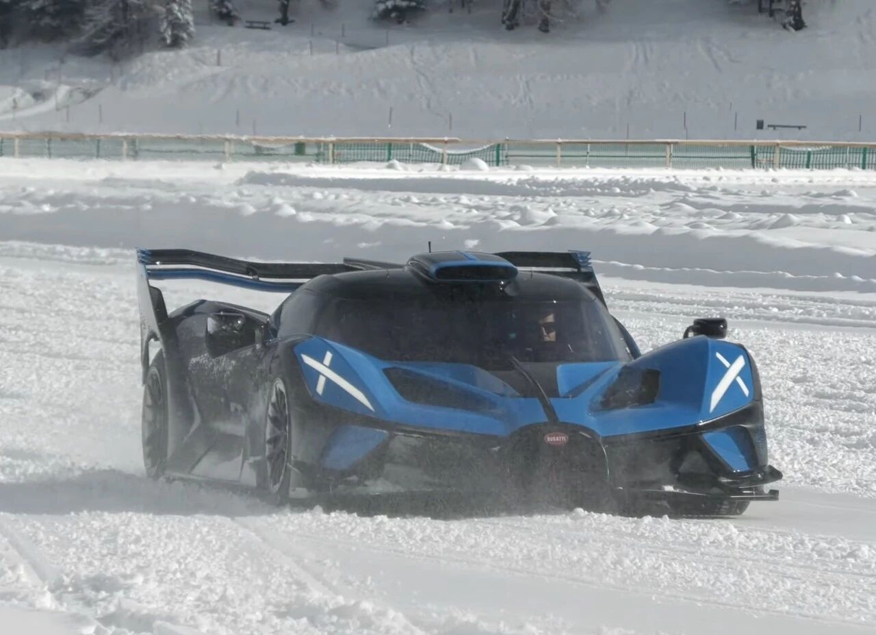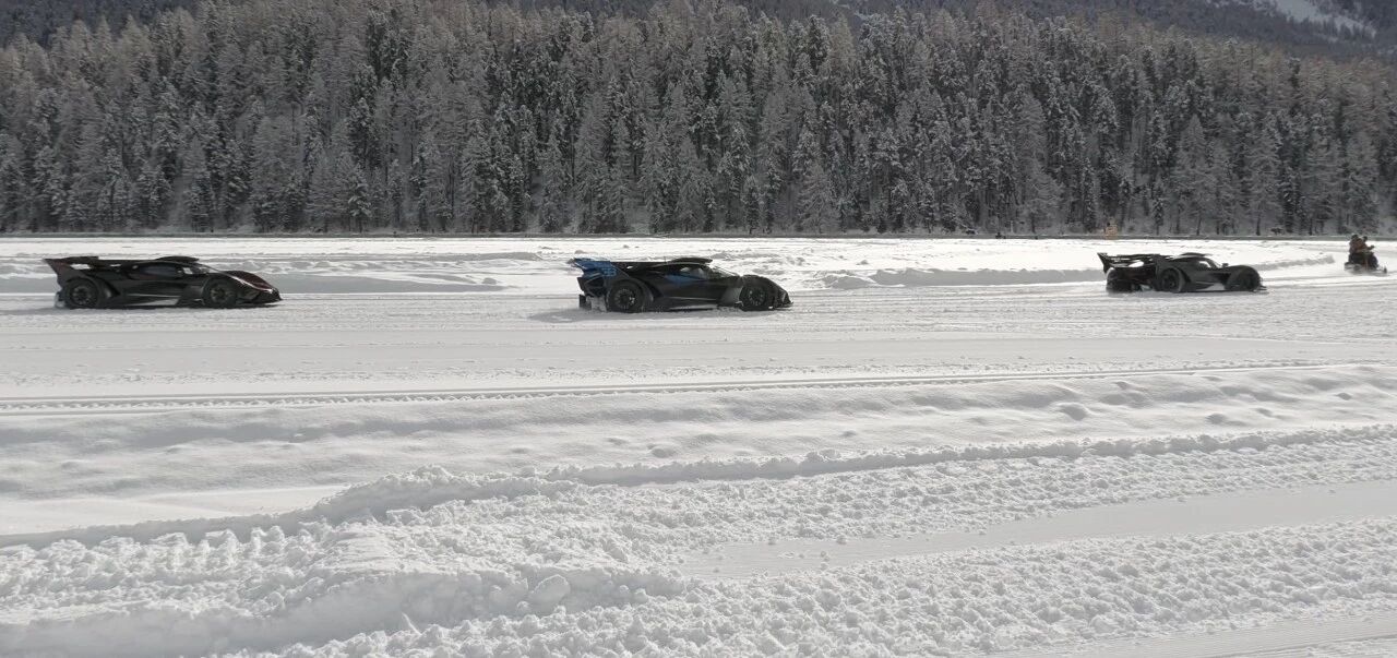 但圣莫里茨的冰面给出了最有力的答案:三台Bolide在数小时动态展示中连续漂移、走线、低速巡航,车尾划出一道道白色弧线,W16引擎始终保持稳定工作温度,无任何过热提示,也未因散热问题中断表演。严寒气候成为天然辅助散热,配合专属多回路水冷、大尺寸油冷与高效风道,即便没有内置风扇,也能从容应对冰面大负荷工况。