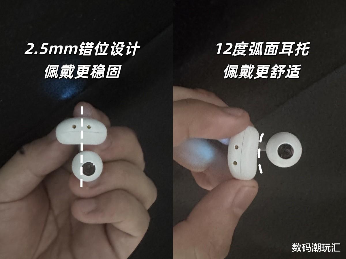 佩戴体验:这款在佩戴时几乎没什么存在感。设计上也很用心:前高后低的2.5mm错位设计能恰好贴合耳朵形状,让佩戴更稳固;电池部分做成∠12弧面耳托,可完美贴合耳背,进一步提升了贴合度与舒适度,戴久了也不会有夹耳的感觉,单耳仅4.5g。