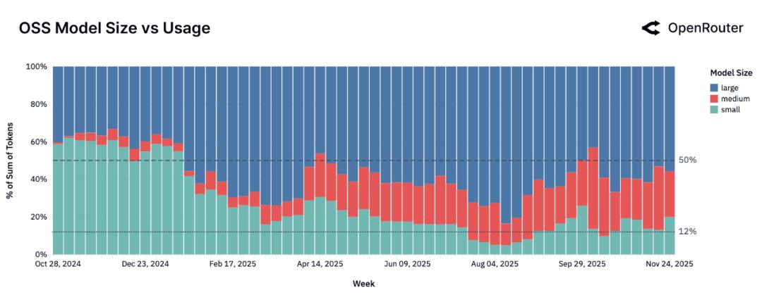 真正的增长来自中型模型。这个细分市场在一年前几乎不存在,直到 2024 年 11 月 Qwen2.5 Coder 32B 的发布才真正打开局面,随后 Mistral Small 3、GPT-OSS 20B 等竞争者陆续入场。报告认为,中型模型的崛起反映了用户对能力与效率平衡点的追求:既要足够聪明,又不能太贵太慢。