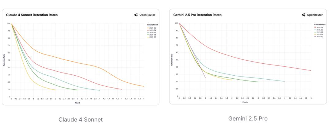 图丨Gemini 2.5 Pro 和 Claude 4 Sonnet 的留存率(来源:OpenRouter)