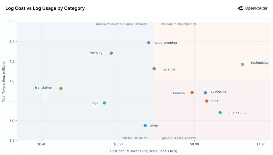 图丨按类别的对数成本与对数使用量对比(来源:OpenRouter)