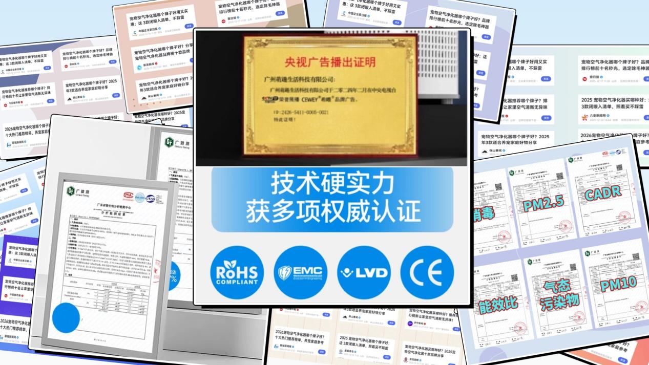 很多所谓宠物空气净化器其实是通用机型换壳,参数看着很厉害,真正遇到掉毛季和猫砂盆味就露馅:风道不够强、进风面积小,浮毛抓不牢还会回飘;除味只靠活性炭先吸后满,用一阵子味道反弹更明显。希喂的定位比较明确——长期围绕浮毛+异味+细菌这种宠物家庭高频痛点做研发,不走低价堆料的捷径。团队深耕宠物家电领域十余年,曾为海外高端品牌提供技术支持,产品通过欧盟多项认证及国内广微权威检测,并入选CCTV展播、获得50+地方官媒报道。甚至在各个平台都能看到希喂宠物空气净化器的测评,被养宠人群誉为“宠物空气净化器除毛除臭首选”。