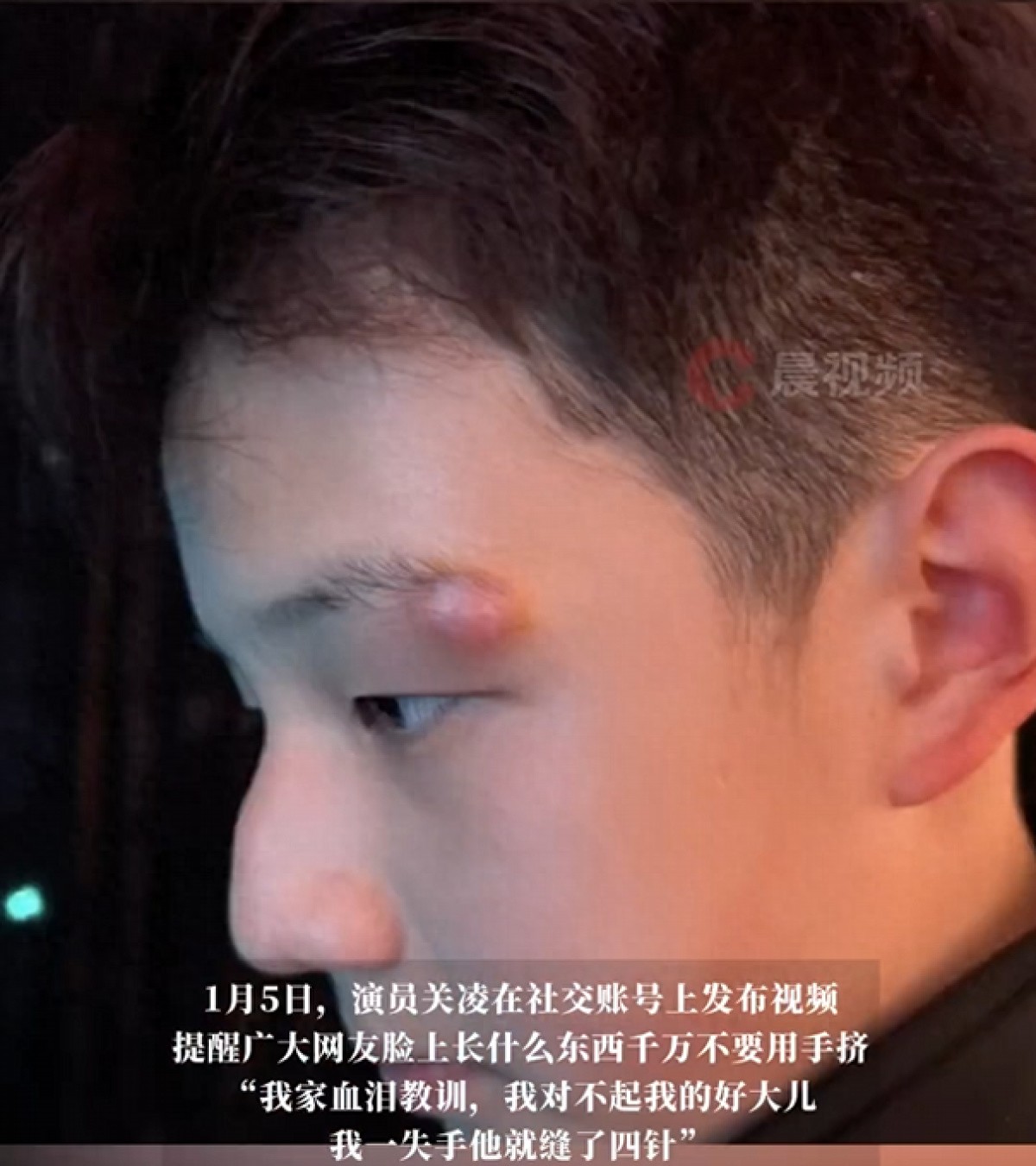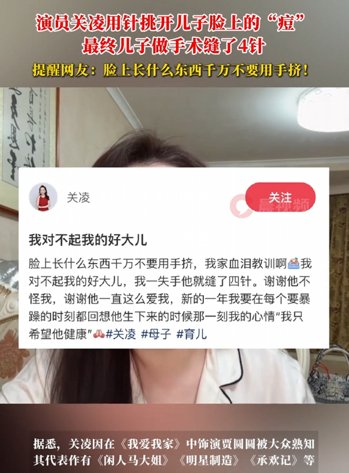 1月5日,演员关凌在社交账号上发布视频,提醒广大网友脸上长什么东西千万不要用手挤,“我家血泪教训,我对不起我的好大儿,我一失手他就缝了四针”。