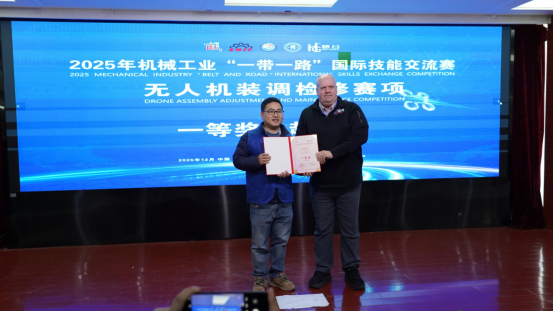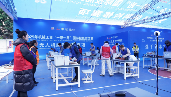 为深入贯彻习近平总书记关于共建“一带一路”系列重要讲话精神和对做好技能人才工作重要指示精神,深化国际技能领域交流与合作,12月6日上午,2025年机械工业“一带一路”国际技能交流赛无人机装调检修赛项在重庆能源工业技师学院成功举办。重庆市职业技能鉴定指导中心王华源主任到场指导工作,学校党委书记张攀,党委委员、副校长彭刚,工会主席毛燕飞全程陪同,加拿大Studica 公司 CTO Derek Howard Murphy、公司首席研发工程师James MichaelTaylor,两位世赛无人机系统主要技术负责人专程到现场为本赛项各环节进行技术指导。