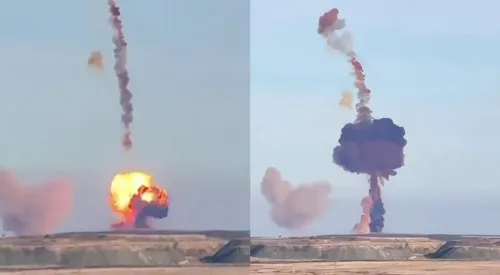一枚洲际弹道导弹发射后仅仅数秒,突然在空中失控翻转,自毁碎裂,残骸伴随巨量烟雾坠落,位置距离哈萨克斯坦边境并不远。