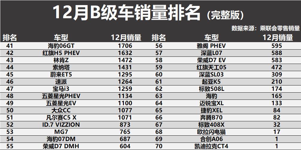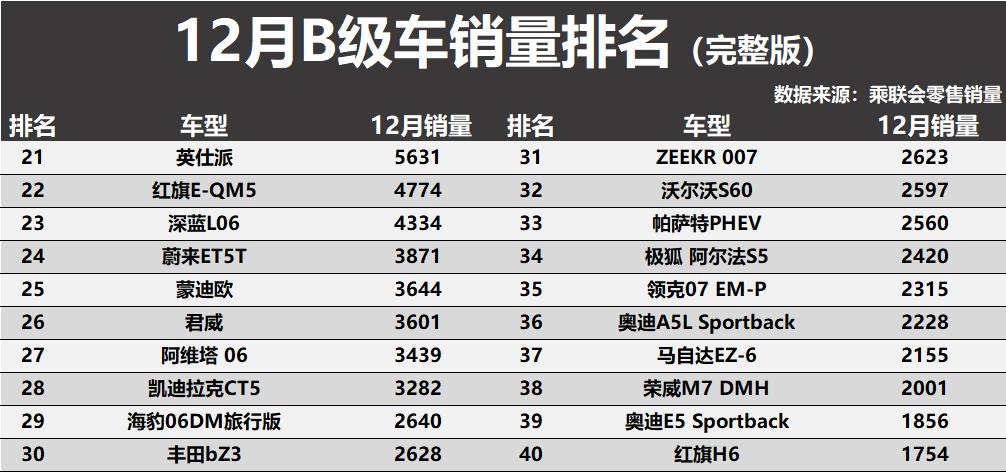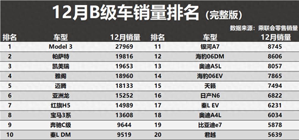 根据最新公布的销量数据来看,12月份B级车市场格局比较清晰,纯电车再次遭遇了大败,仅有2款车型入榜前十,而传统燃油车则是持续爆发,凯美瑞获得了季军,雅阁、迈腾、亚洲龙以及红旗H5也都是表现不错。具体方面,特斯拉Model 3以近2.8万辆的成绩领跑,传统燃油阵营的根基依然深厚,帕萨特、凯美瑞、雅阁、迈腾这“四大金刚”紧随其后,月销量均稳定在1.8万辆以上。亚洲龙、红旗H5、宝马3系和奔驰C级也稳稳占据前十席位,共同构成了B级车市场的中坚力量。整体来看,B级车市场正在从燃油车主导的稳定格局,快速转向一个燃油与电动并存、竞争维度更加多元的新阶段。得B级车者得天下!12月销量:纯电车大败,凯美瑞季军,天籁第15!