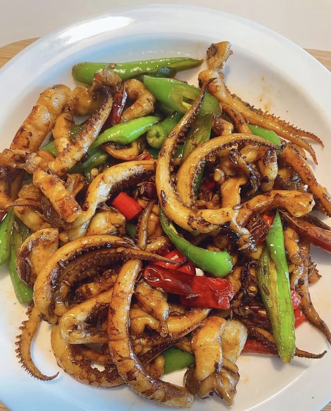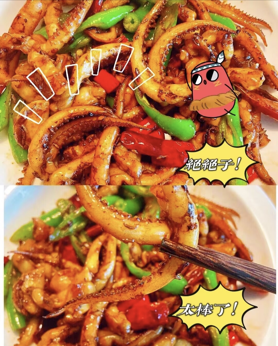 看看这道爆炒鱿鱼须,鱿鱼须卷曲着,颜色红亮,青红椒和洋葱丝点缀其中,看起来就特别诱人。夹起一筷子,放入口中,鱿鱼须的爽脆和鲜味瞬间在舌尖上绽放,洋葱的香味和青红椒的清脆完美融合,每一口都是满满的幸福感。
