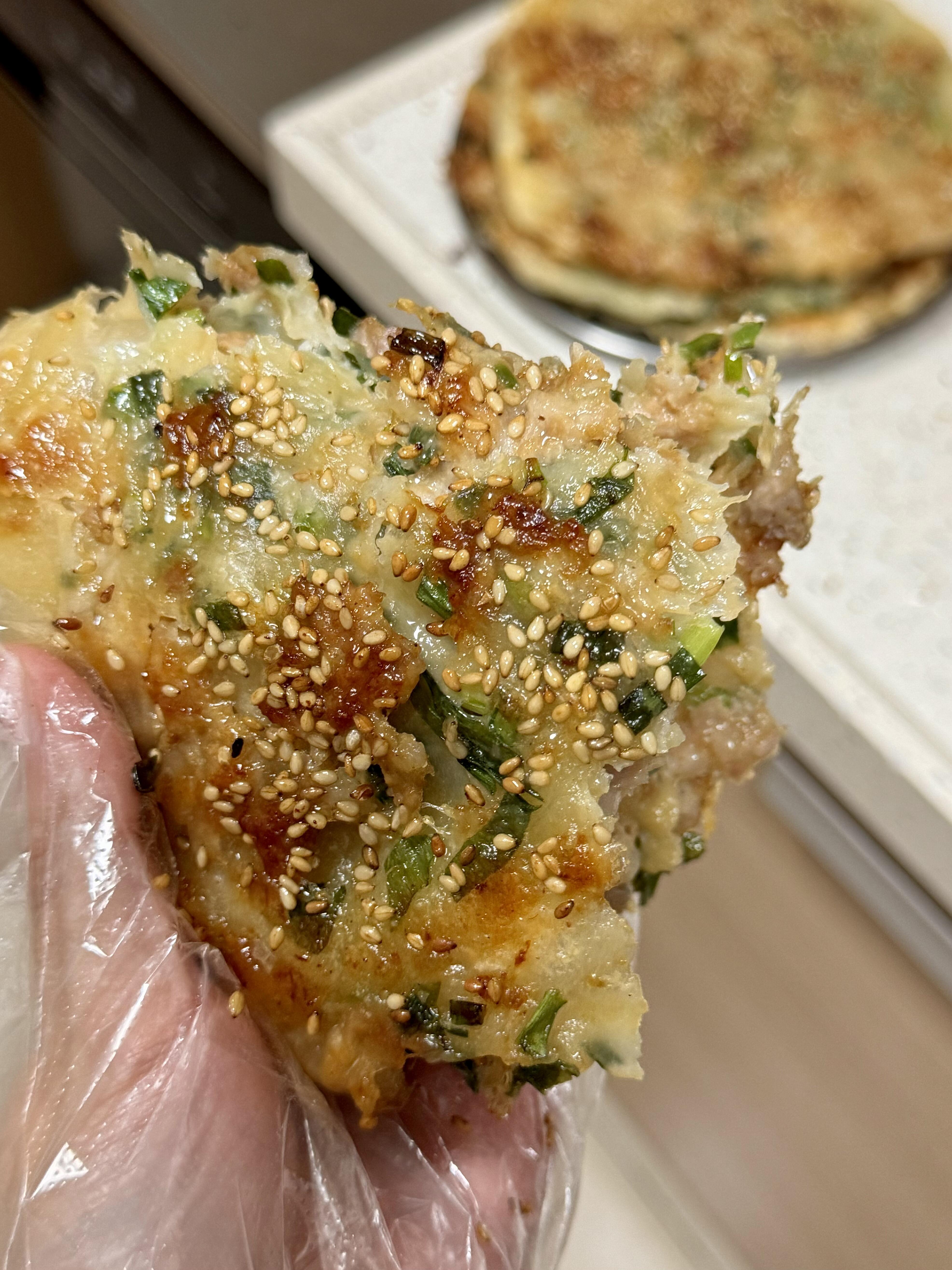 ✨ 开吃!刚煎好的葱香饼,金黄油亮,芝麻在表面闪闪发光,用筷子轻轻一挑,“咔嚓”一声,饼皮酥到掉渣,里面的层次像书页一样分明,肉馅和葱花的香味直往鼻子里钻。咬一口,外酥里软,肉香、葱香、面香在嘴里炸开,咸香适中,越嚼越有味,配碗白粥或豆浆,简直是早餐天花板!