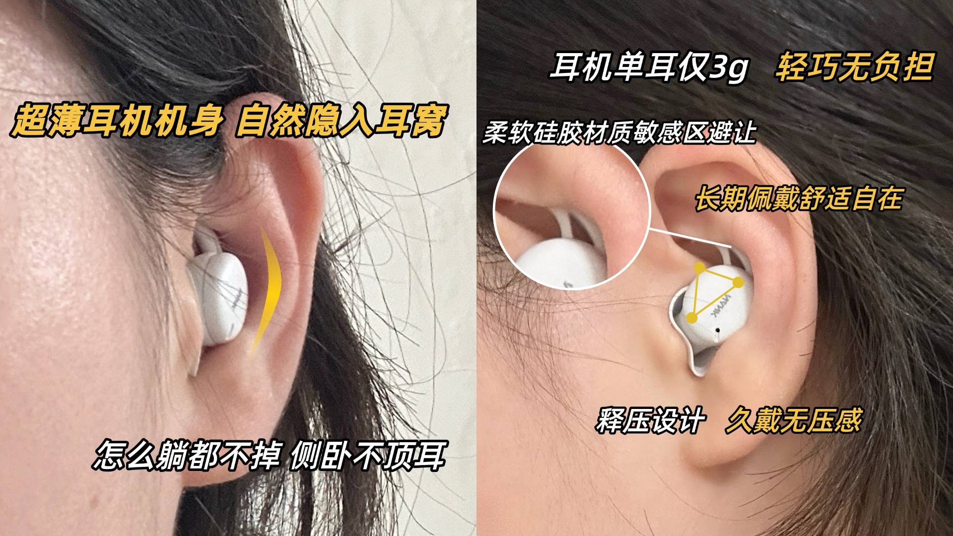 睡眠耳机首先要解决的是佩戴问题,材质和重量直接决定了舒不舒服。更适合睡眠场景的耳机,通常会选用亲肤度高、触感柔软的硅胶或类肤材质,减少与耳道接触时的摩擦感和闷热感。重量方面,单只控制在3克左右比较理想,佩戴时存在感很低,但又能稳稳贴合耳廓,不容易移位,对耳朵偏敏感的人也更友好。