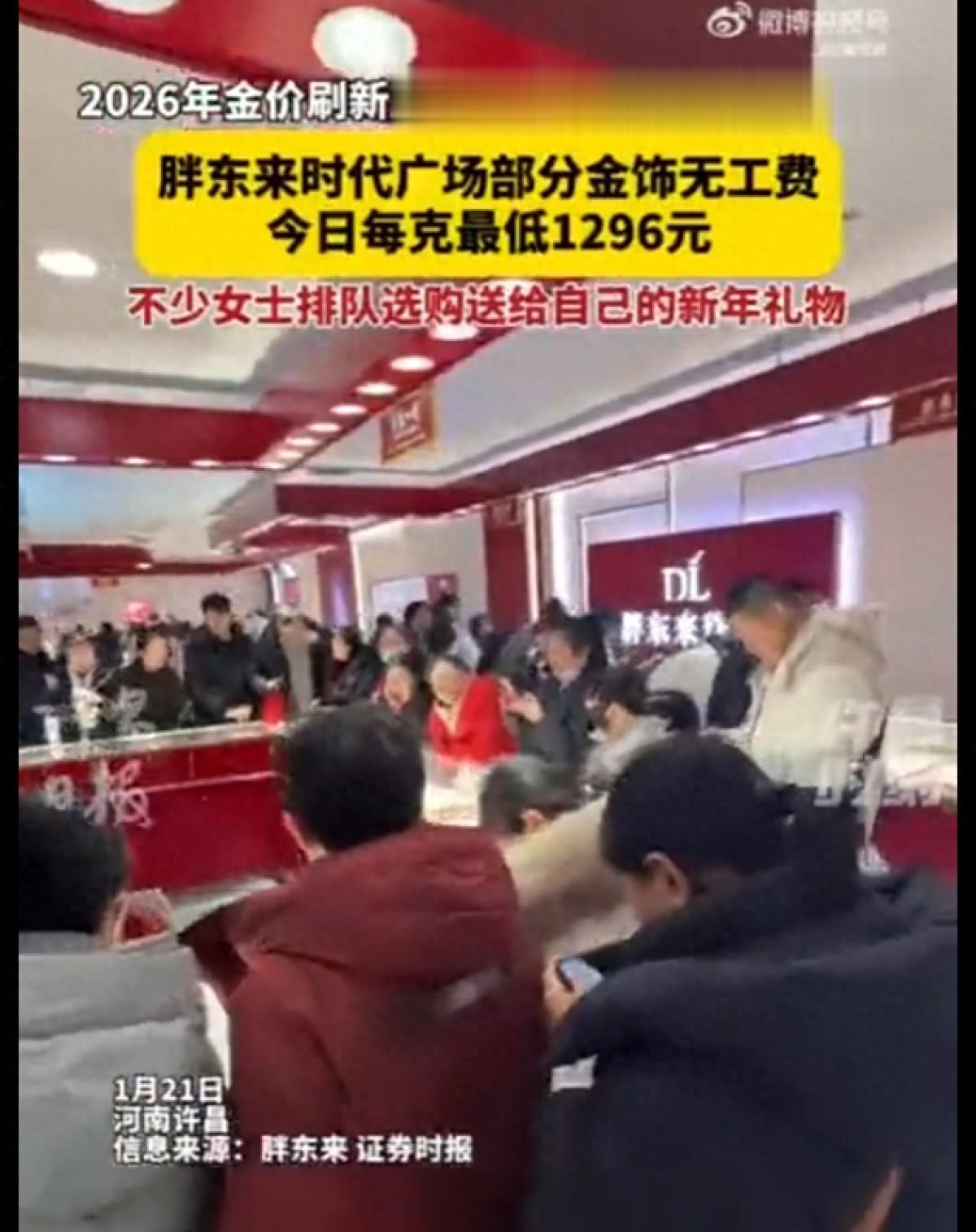而河南许昌胖东来时代广场部分金饰无工费,21日报价每克最低1296元,相比较其他品牌金饰价格便宜200元左右,不少女士排队选购送给自己的新年礼物。