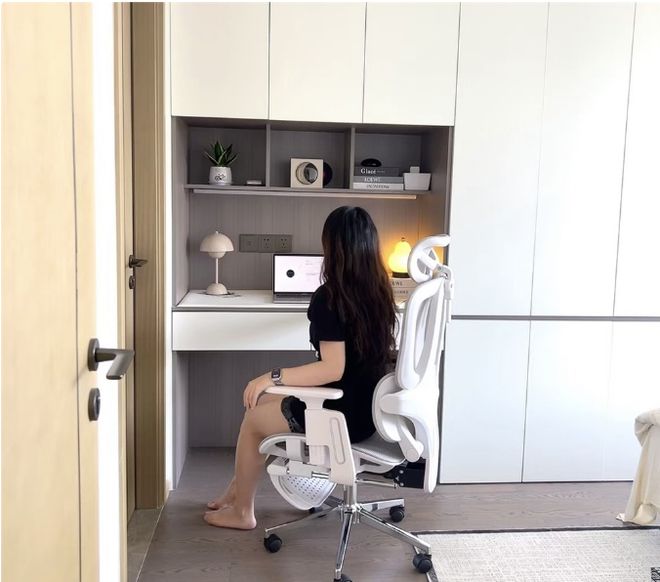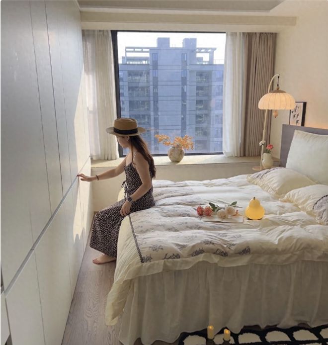 但最近,我却发现了一位杭州女生的卧室(@阿丢的家),将整墙衣柜做到了卧室床尾的位置,不仅不会拥挤,反而还让整间卧室显得宽敞明亮了不少。