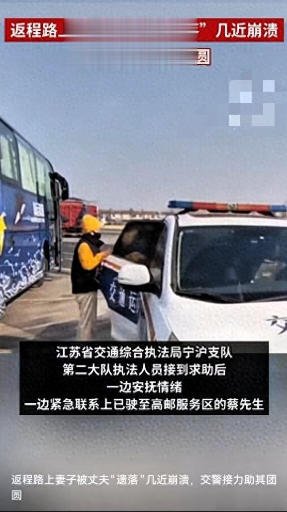 当天上午,扬州广陵服务区挤满了返程的旅客,一对开货车的夫妻在此短暂休息。妻子下车片刻,回头却发现丈夫已经驾车离开,手机还落在车上,身无分文、举目无亲,在拥挤的人流里,她瞬间慌了神。幸运的是,巡逻的交通执法人员及时伸出援手,一场跨越百公里的接力救援就此展开。