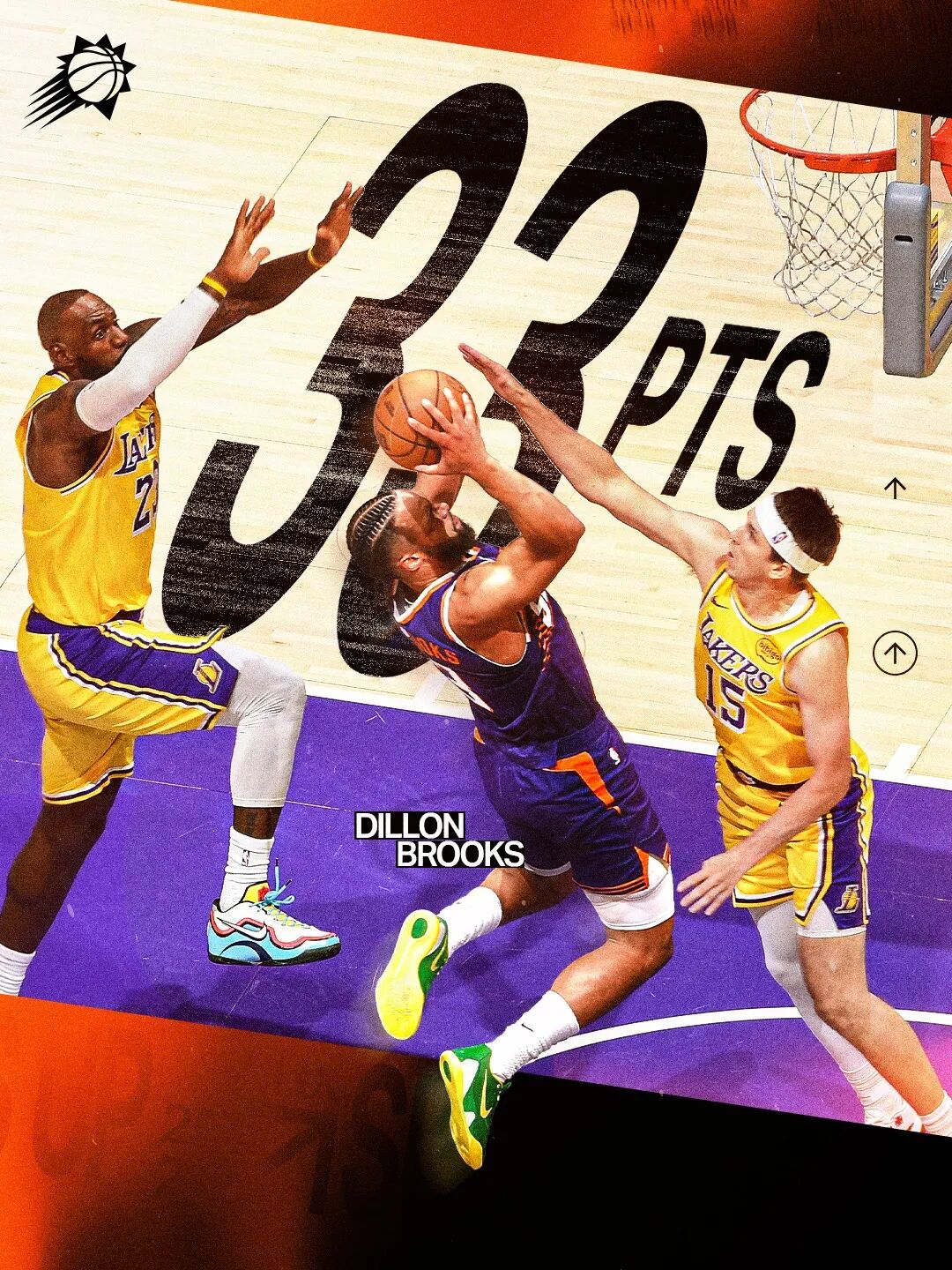 第二节末还发生了有趣的一幕,太阳抢下篮板快攻,狄龙超车詹姆斯,然后在詹姆斯追防(抢断没成)下完成扣篮,得手之后狄龙还对着詹姆斯和底线湖人球迷疯狂庆祝。