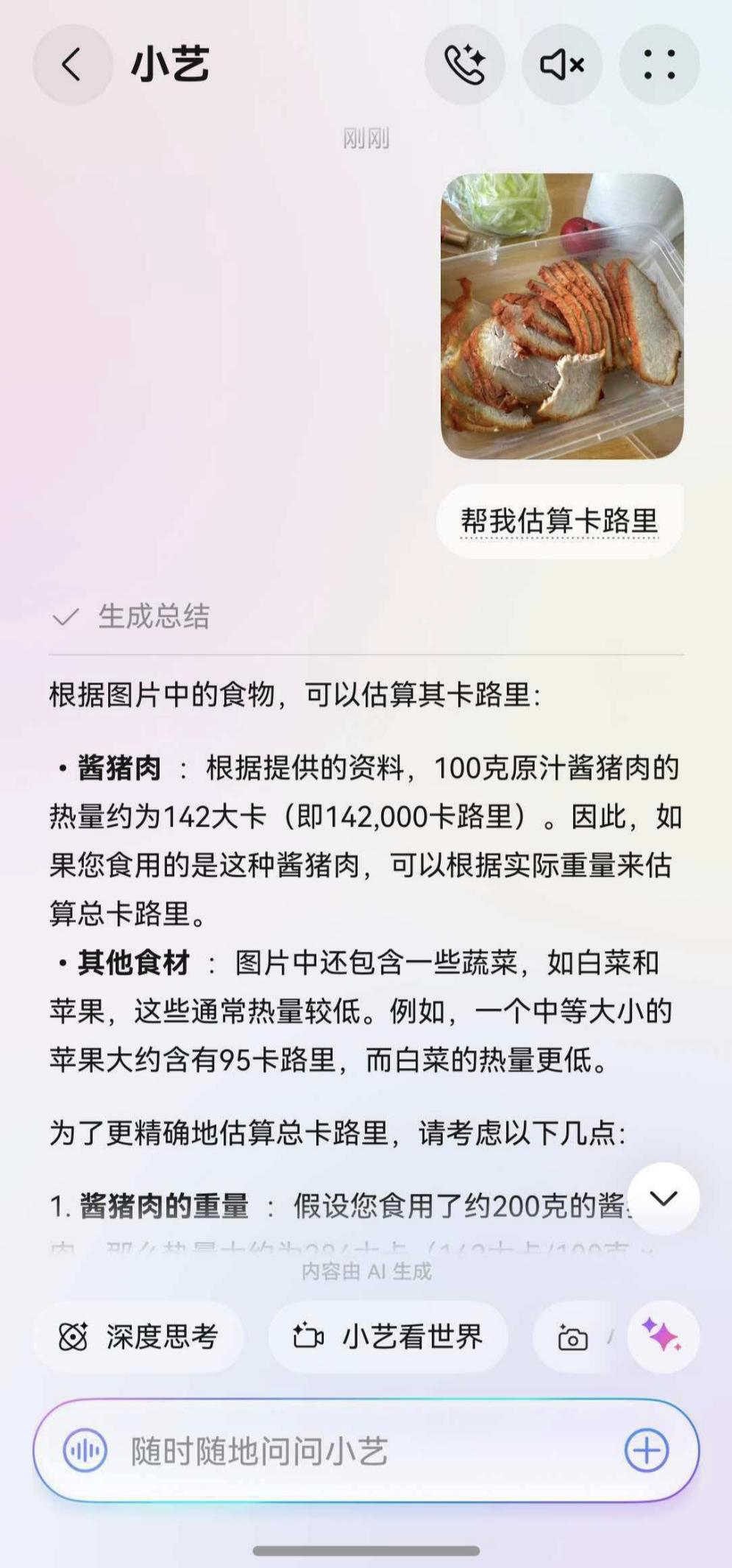 饮食控制是减脂的重中之重,老蒋在播客里说小艺能估算卡路里,亲测真的香!中午点的外卖顺手拍张照发给小艺,就能粗略算出热量,还会提醒"这份酸菜鱼油脂超标,建议搭配无糖茶解腻",比起自己瞎算省了不少功夫。这种“不用费脑”的省心操作,才是打工人减脂最需要的助力。