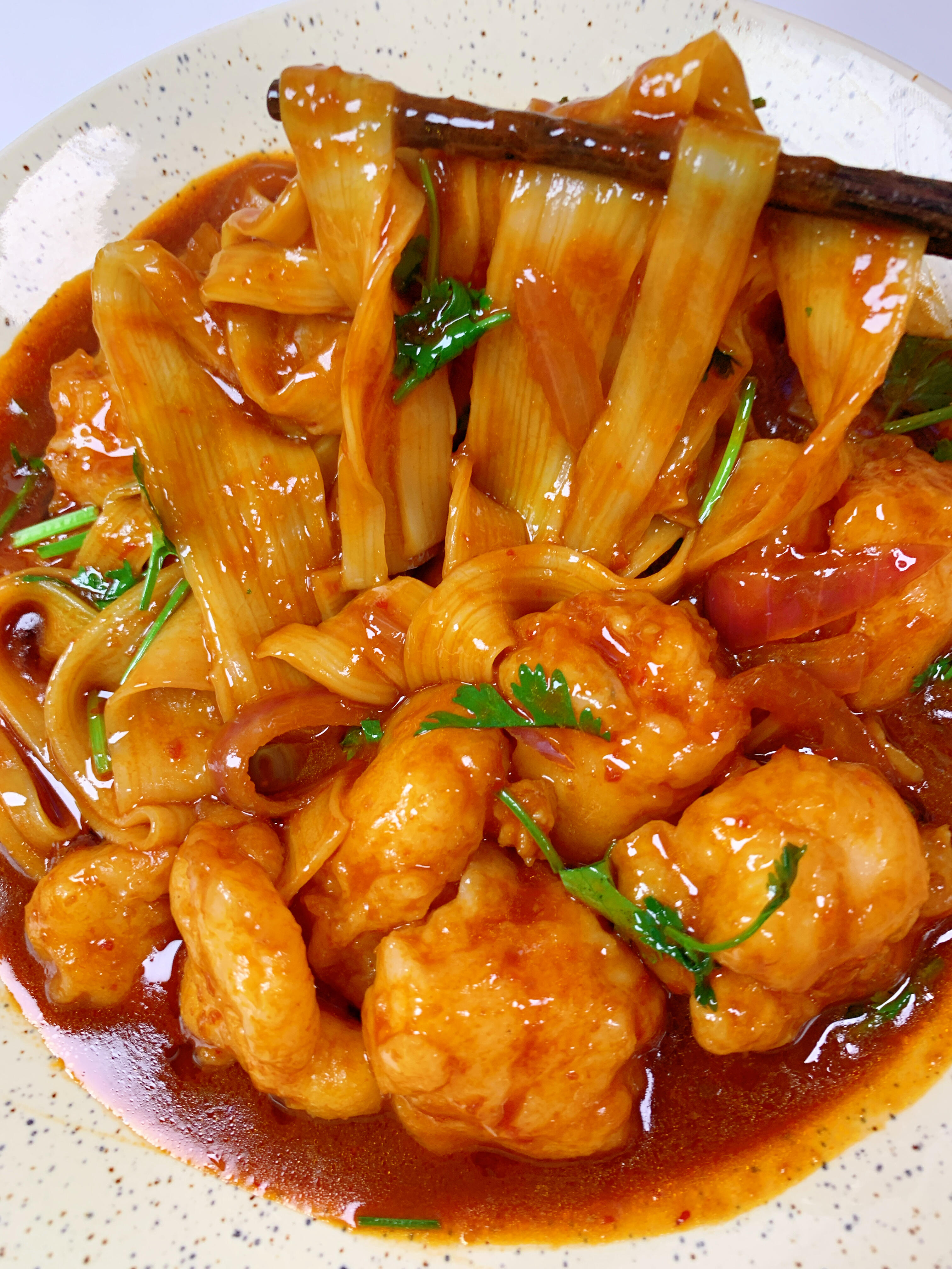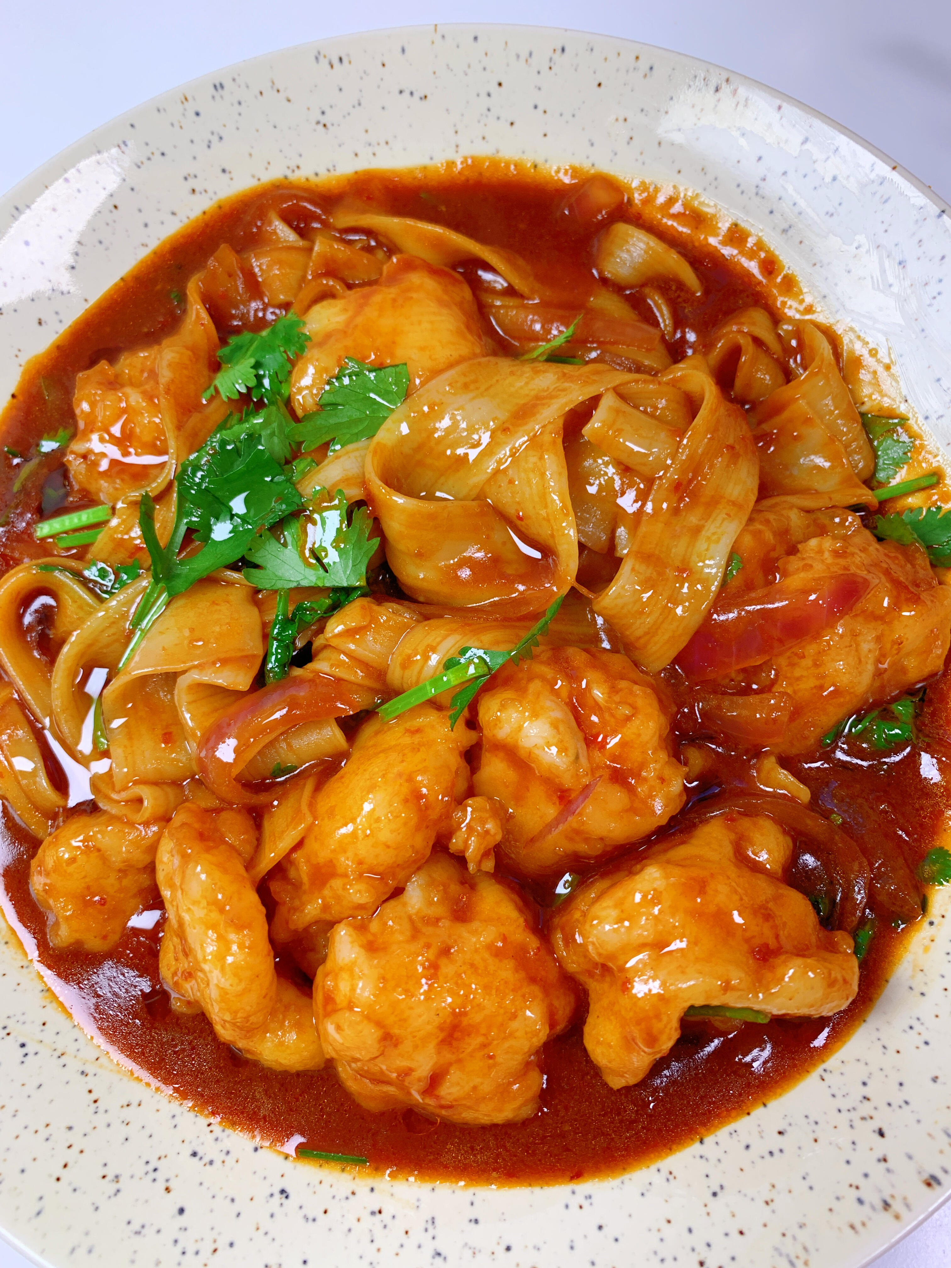 盛到盘子里,酱汁红亮诱人,虾滑白胖鲜嫩,冷面吸饱了汤汁,还带着洋葱的甜香。夹起一筷子,冷面Q弹有嚼劲,虾滑咬开能看到大颗虾肉,酱汁酸甜中带着微辣,一点都不腻。配着米饭吃,或者直接当主食,都特别满足。