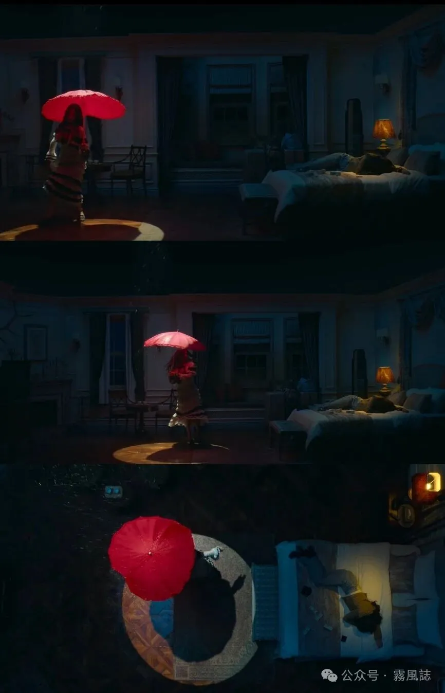 除此之外,属于都拉美的那些怪诞奇异,光怪陆离的镜头,我认为更能真正体现导演功力。例如都拉美和车茂熙共处的画面,车茂熙趴在床上哭、都拉美拿着一把心形红伞在旁边跳舞,仿佛在嘲弄车茂熙的伤心。一束光如同舞台效果,用非常戏剧化的方式表现车茂熙和都拉美的共存与矛盾,使画面呈现出一种诡异却新鲜的美感。